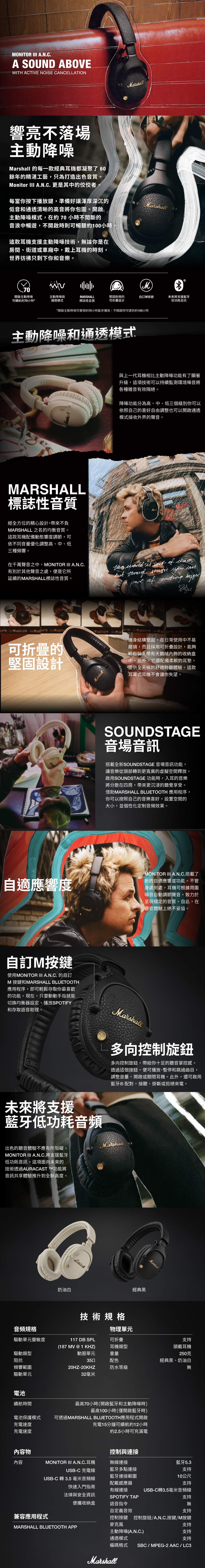 - Marshall 標誌音質 :可依不同音量優化調整高、中、低三種頻響,呈現均衡優異的音效。